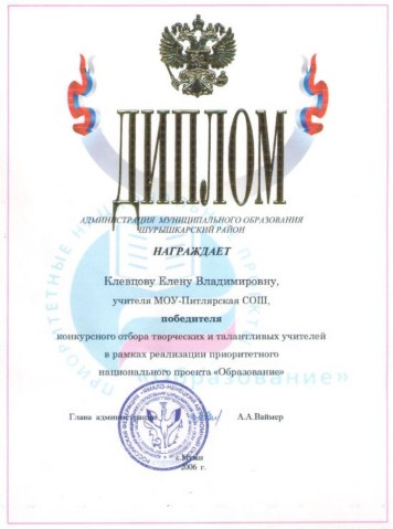 Грант Главы администрации МО Шурышкарский район, Диплом победителя конкурсного отбора талантливых учителей в рамках реализации национального проекта "Образование", 2006 г. |