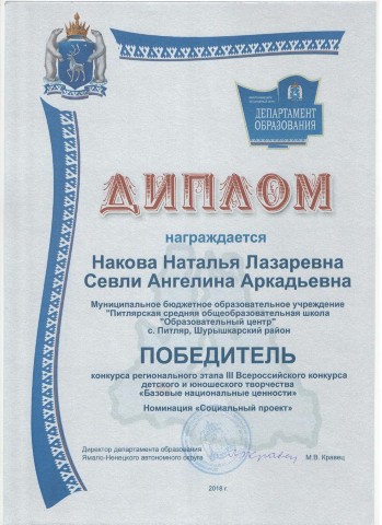 Диплом Победителя, Накова Н., Севли А., региональный этап 3 Всероссийского конкурса "Базовые национальные ценности", номинация "Социальный проект", руководители Гевкан Е.И., Клевцова Е.В.,Салехард, 2018