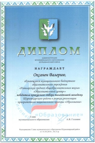 Диплом победителя в конкурсном отборе талантливой молодежи Шурышкарского района в рамках реализации приоритетного национального проекта "Образование", 2016.