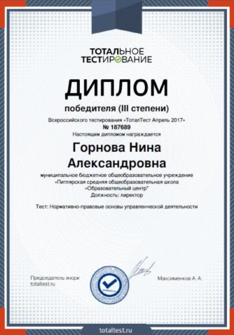 Диплом победителя 3 степени Всероссийского тестирования "ТоталТест Апрель 2017", Нормативно-правовые основы управленческой деятельности, Горнова Н.А. |