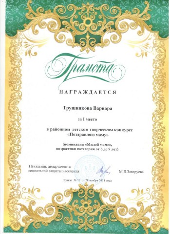 Грамота за 1 место в районном творческом конкурсе "Поздравляем маму", Трушникова В., 2018 |