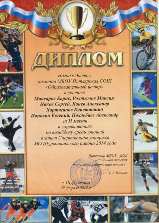 2 место по волейболу среди юношей, в зачет Спартакиады МО Шурышкарский район, с. Шурышкары, февраль 2014 г. |
