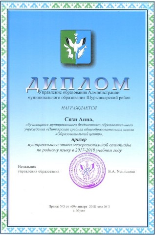 Диплом призера муниципального этапа межрегиональной олимпиады по родному языку в 2017-2018 учебном году, Сязи А., 6 класс, рук. Серасхова Э.П., Мужи, январь 2018 г. |