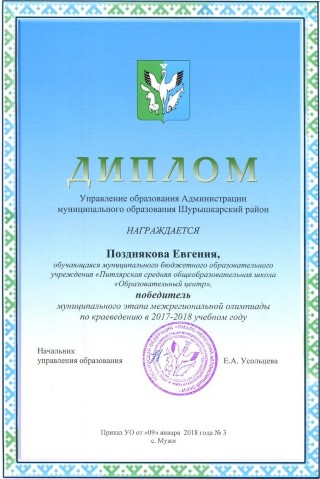 Диплом победителя муниципального этапа межрегиональной олимпиады по краеведению в 2017-2018 учебном году, Позднякова Е., 5 класс, рук. Серасхова Э.П., Мужи, январь 2018 г. |
