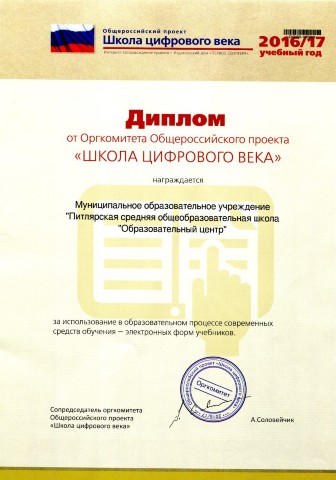 Диплом "Школа цифрового века" за использование педагогическим коллективом ОУ возможностей современных информационных технологий и цифровых предметно-методических материалов, 2017 г. |