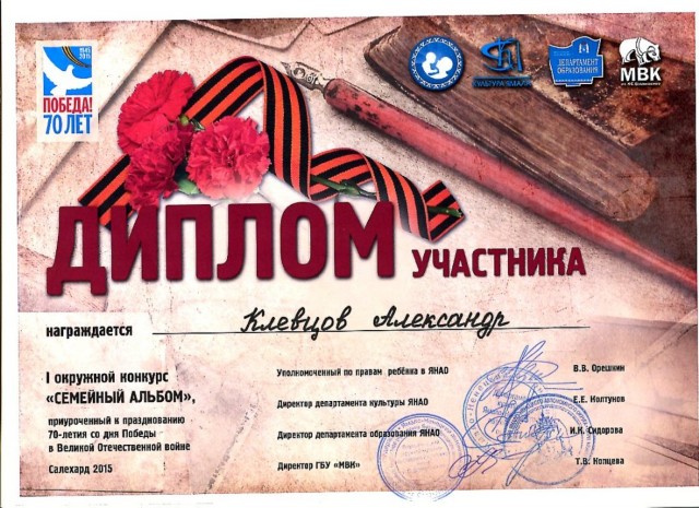 Диплом 2 степени в районном творческом конкурсе "Этих дней не смолкнет слава", Оксанен В., 9 кл., рук. Оксанен К.П., 2016 |