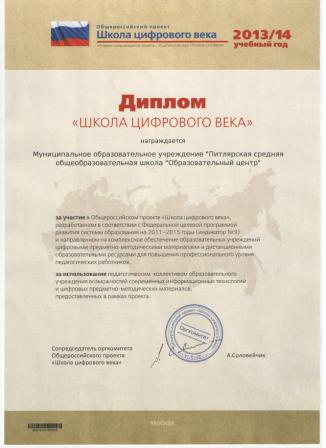 Диплом "Школа цифрового века" за участие в Общероссийском проекте, 2012-2013 г. |