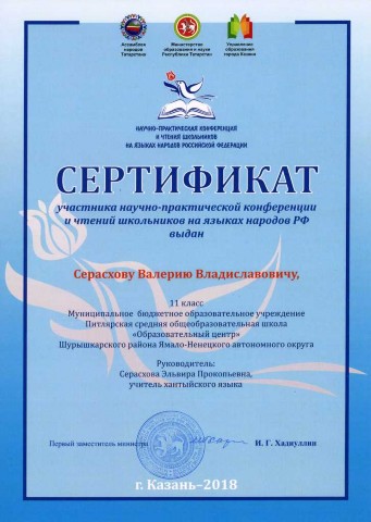 Сертификат участника научно-практической конференции и чтений школьников на языках народов РФ, Серасхов В., рук. Серасхова Э.П., 2018 |
